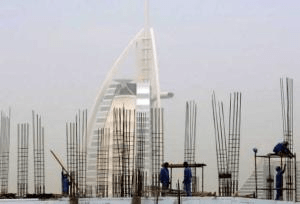 Construction workers in their distinctive blue overalls building the upper floors a new Dubai tower, with the distinctive Burj al-Arab hotel in the background
